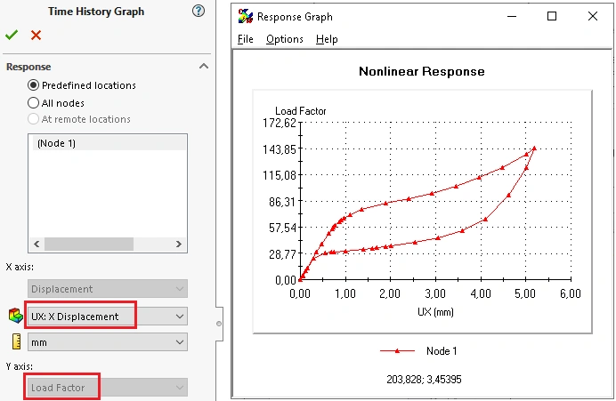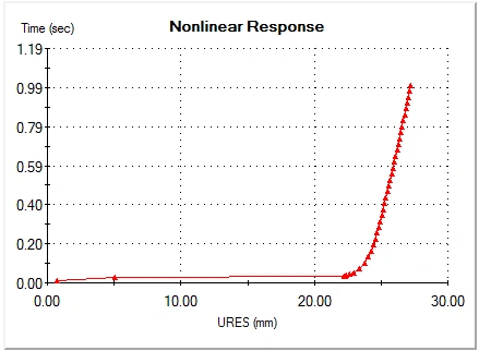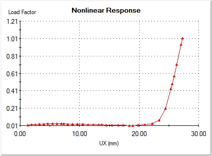 - Change the solution control method. When contacts are not considered, try switching to Displacement control and monitoring when load factor is 1. This is useful when the solver detects limit state of buckling behavior. You can detect this type of behavior by displaying a response graph of displacement vs time for nodes with large displacements. A vertical tangency when the analysis fails indicates a local buckling. You can overcome a local buckling by using the Displacement or Arc-Length controlled methods.