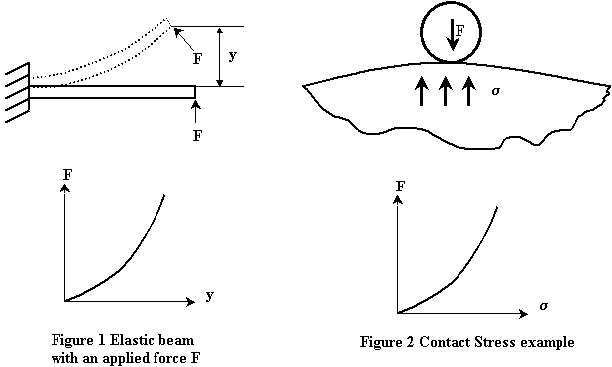 Figure 1 shows an elastic beam with a force F load that acts normal to the axis of the beam at all times. The graph between F and the vertical displacement y represents the actual nonlinear displacement, which occurs because of geometric nonlinearity. This means that because of significant changes in the geometry of the structure as it deforms, the deflection y is not proportional to the applied force F.
