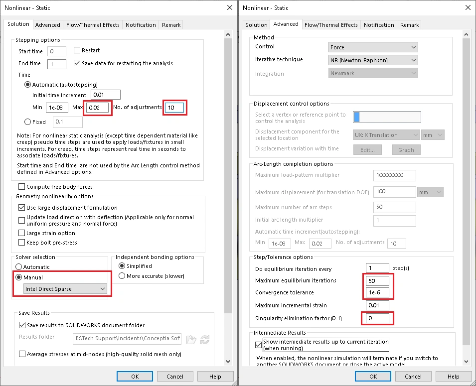 For additional information, refer to the “Best Practices for Getting Quality Results from Nonlinear Analysis in SOLIDWORKS Simulation” by Julien Boissat and Jay Seaglar from SOLIDWORKS World 2014. This information is available in QA00000121588.