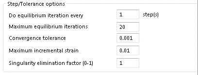 - Slightly increase Convergence tolerance (no more than 0.01) or the Maximum incremental strain (no more than 0.05).