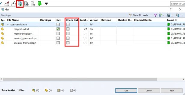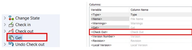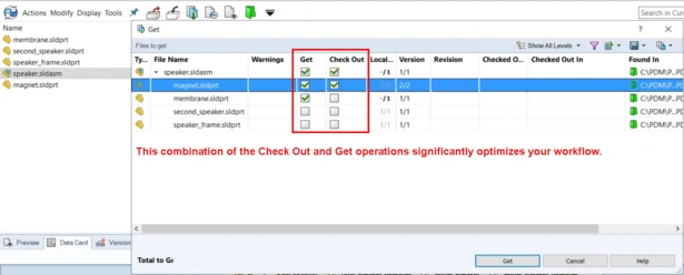 In the Get dialog box, if you select one or more files and then choose the Check Out option, the Get option will be automatically selected for you. You can also include a Check Out column in the Get dialog box of SOLIDWORKS PDM File Explorer in Administration tool.