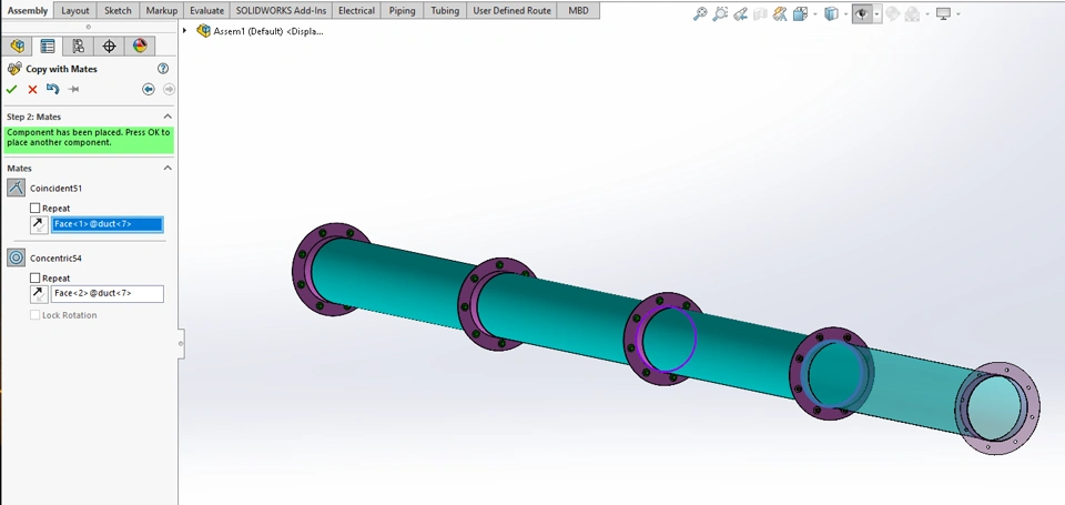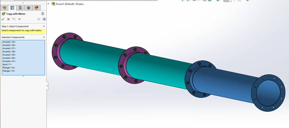 Imagine you have a section of duct with flanges and screws mated to it. Normally, you’d copy each component individually, setting up mates for each flange and each screw in the new position. Instead, follow these steps: