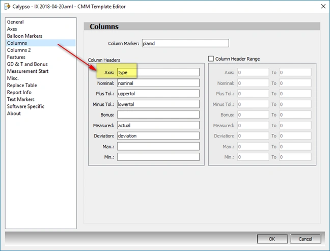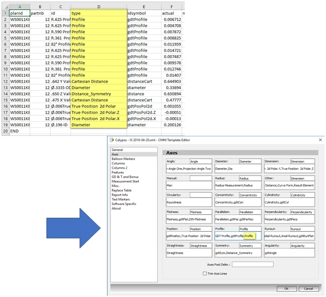 2. Axis Name Variability:  Similarly, For some CMM software, the programmer has control over what the axes are called, which can vary between different setups. If axis names are missing or mismatched in the data file compared to your template, it can lead to incomplete or inaccurate data imports. The template has to match the information in the CMM Data File.  Example: