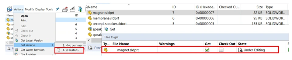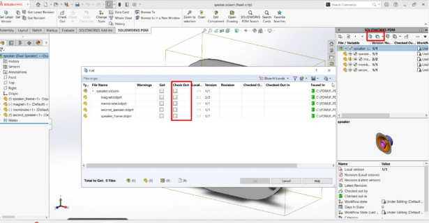 With PDM 2025, these processes have been integrated. Now, when you select either a part or assembly file, a dialog box enables you to check out and retrieve the version at the same time.
