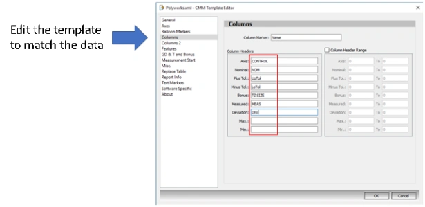 1. Column Name Variability: In some CMM software, programmers have control over what the columns are called. The default settings for column names might differ significantly from what your SOLIDWORKS template expects. If the column names in the CMM data file do not match those in your import template, data may fail to import or import incorrectly. Example: