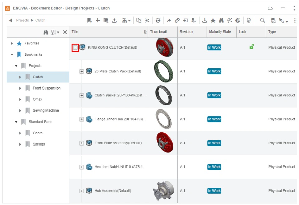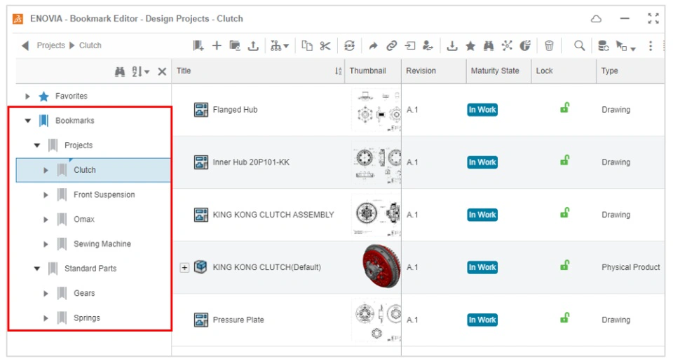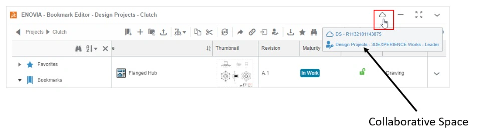 As stated previously in this section, Collaborative Spaces are not intended to act as folders, and the content contained within a Collaborative Space is stored in a flat structure. To help you transition from folders to the 3DEXPERIENCE platform, it is strongly recommended that you are familiar with Bookmark folders as the primary method of organizing your SOLIDWORKS Design content. Bookmark folders behave similarly to Windows folders; users can add SOLIDWORKS content to a Bookmark for easy access, and create Bookmark hierarchies in the same way that they would folder structures.