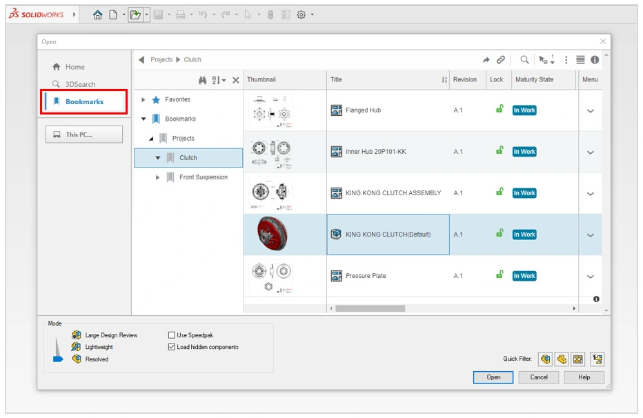 For more recommendations related to working with Bookmark folders in SOLIDWORKS Design, please refer to the adoption guide section titled Basic SOLIDWORKS File Management.
