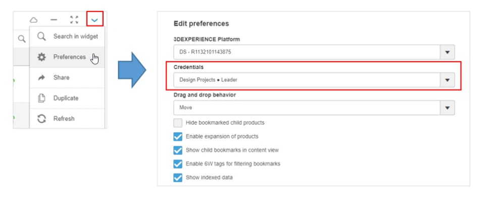 To switch SOLIDWORKS Design to a different collaborative space, select the drop-down arrow next to the collaborative space name, click on the preferences icon, and set the credentials to the desired collaborative space.