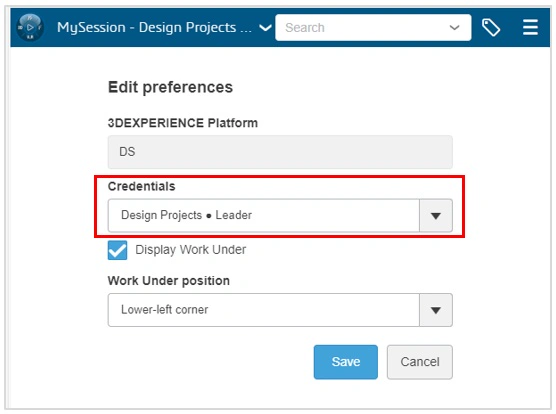 All new files saved to the 3DEXPERIENCE platform for the first time will be assigned to the collaborative space displayed under Credentials.