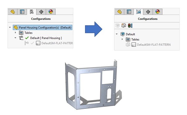 When designing Sheet Metal parts in SOLIDWORKS, configurations are used to represent the folded and flattened states. The flattened state configuration represents the manufacturing definition of the finished part. For most companies both configurations will represent the same part and part number, therefore the one Physical Product configuration per file strategy should be applied. It is recommended that the folded configuration of part is defined as the Physical Product configuration, and the flattened configuration is defined as a Representation configuration.