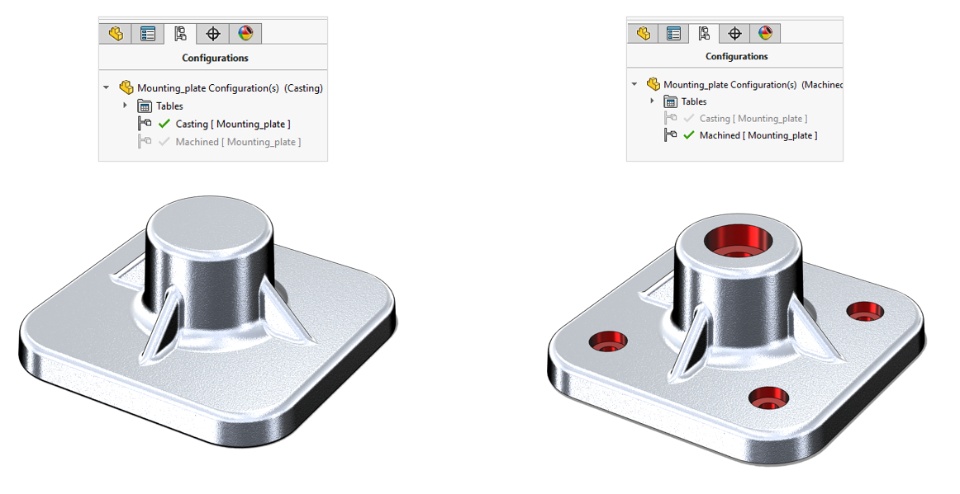 SOLIDWORKS configurations provide a simple and efficient method of capturing the cast and machined variations of a part.