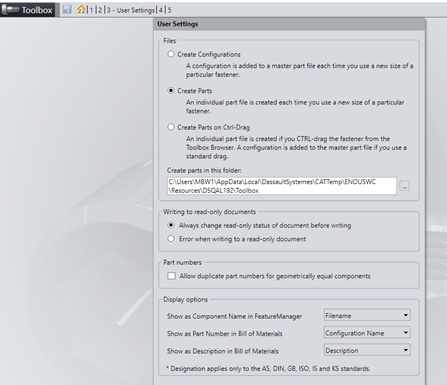 Unlike SOLIDWORKS Desktop with Collaborative Designer for SOLIDWORKS, the SOLIDWORKS Design app does not include the Files setting in Toolbox Settings. This is by design. The Create Parts setting is force-activated and cannot be changed.