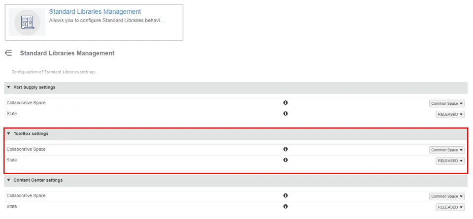 Before uploading Toolbox parts to the 3DEXPERIENCE platform, the default collaborative space and initial maturity state of uploaded Toolbox components can be configured from the Standard Libraries Management area of the Collaborative Spaces Configuration Center.