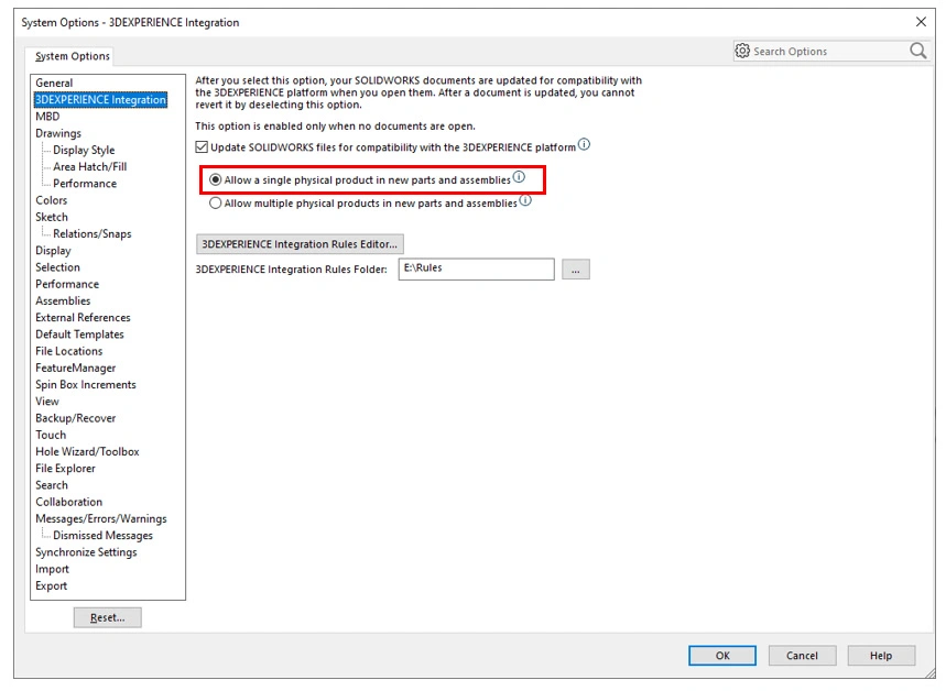 To help enforce this methodology for new designs, from SOLIDWORKS 2024 SP1, a SOLIDWORKS system option can be enabled to “allow a single physical product in new parts and assemblies. This option is on by default for new installations of SOLIDWORKS Design.