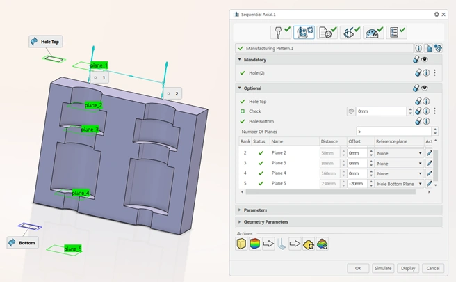 Increase the flexibility and efficiency of sequential axial operations by simplifying the selection of bottom and top, and adding circular motion. The axial plane of a sequential axial activity references the stock top plane, stock bottom plane, hole top plane, hole bottom plane, and other axial planes. Define a sequential axial activity in a more generic way.  Define a chain of planes with the ability to use another axial plane as a reference.