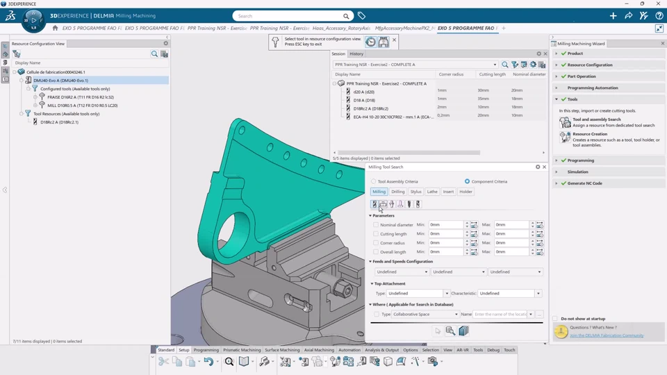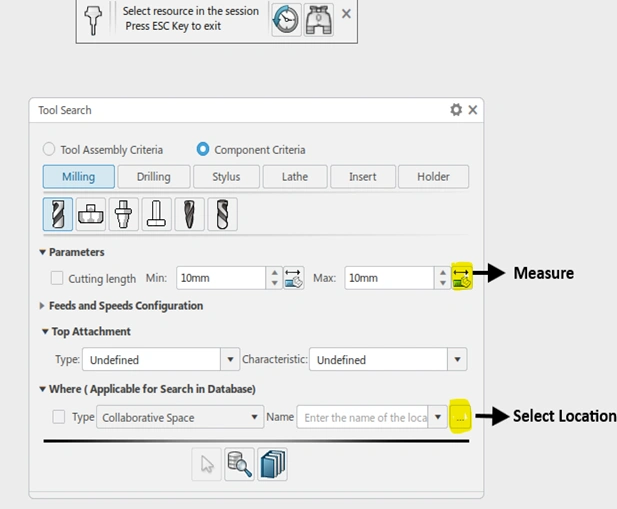 Simplify the selection of cutting tools using a search with history or by filling measured geometries. Fill the parameter value using measure. Select the search location from all available locations using the Where filter for libraries or collaborative spaces. View the relevant resources from all opened tabs using the “All tabs” option available in the Session Panel.