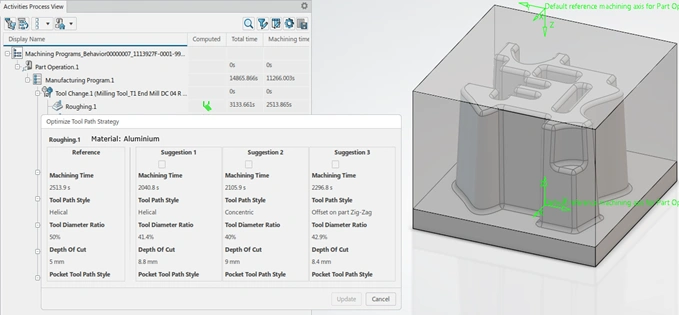 Minimize the machining time in roughing operations leveraging AI to automatically generate alternate toolpath strategies and parameters. AI suggests a preferred tool path strategy and parameters for the selected geometries in Roughing and Prismatic Roughing Operations.