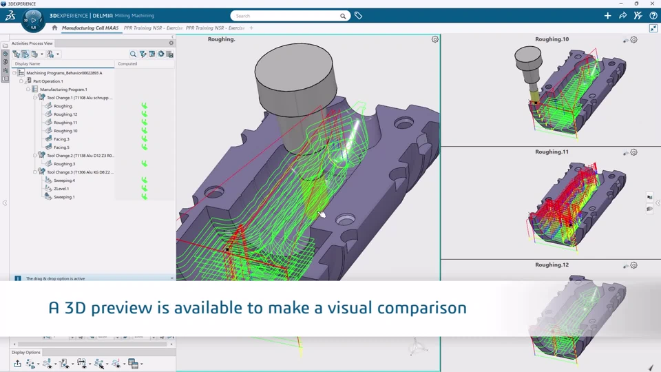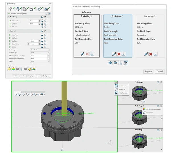 Easily compare toolpaths using the multi-view mode to evaluate modifications between releases and when changing key parameters. Compare two machining activities, the same activity after a force computation during a release migration, and the same activity with different strategy parameters.