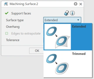 Increase programming flexibility with the ability to create Extended or Trimmed surfaces by extending existing surfaces, avoiding going back and forth with the CAD model. Select Faces to define the surface area. Set an overhang to widen the surface. Optionally, select Edges to extrapolate the resulting surface beyond the initial face boundaries. Preview the generated surface before validation and use a dedicated editing panel to refine selections and parameters.