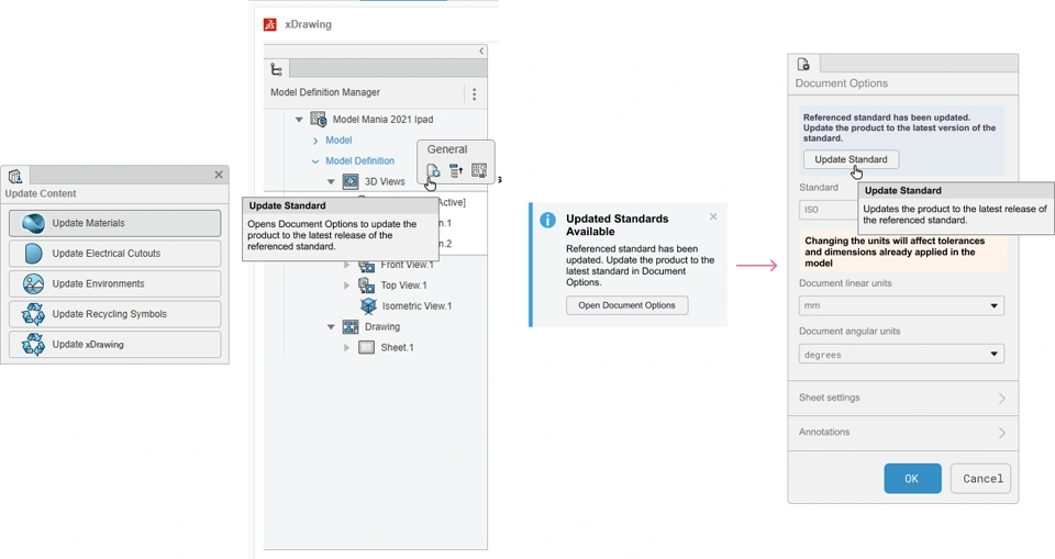 Eliminate onboarding barriers by automatically creating all required xDrawing standards during Admin setup, ensuring every user can immediately create Annotation Sets without waiting for manual initialization. A unified update content workflow now keeps xDrawing standards current across releases while preserving existing settings, reducing admin overhead and preventing workflow disruptions. Users opening older Annotation Sets are guided with clear prompts and a simple update standard action to bring documents up to date. Together, these improvements deliver a smoother, more reliable experience for teams, classrooms, and large organizations alike.