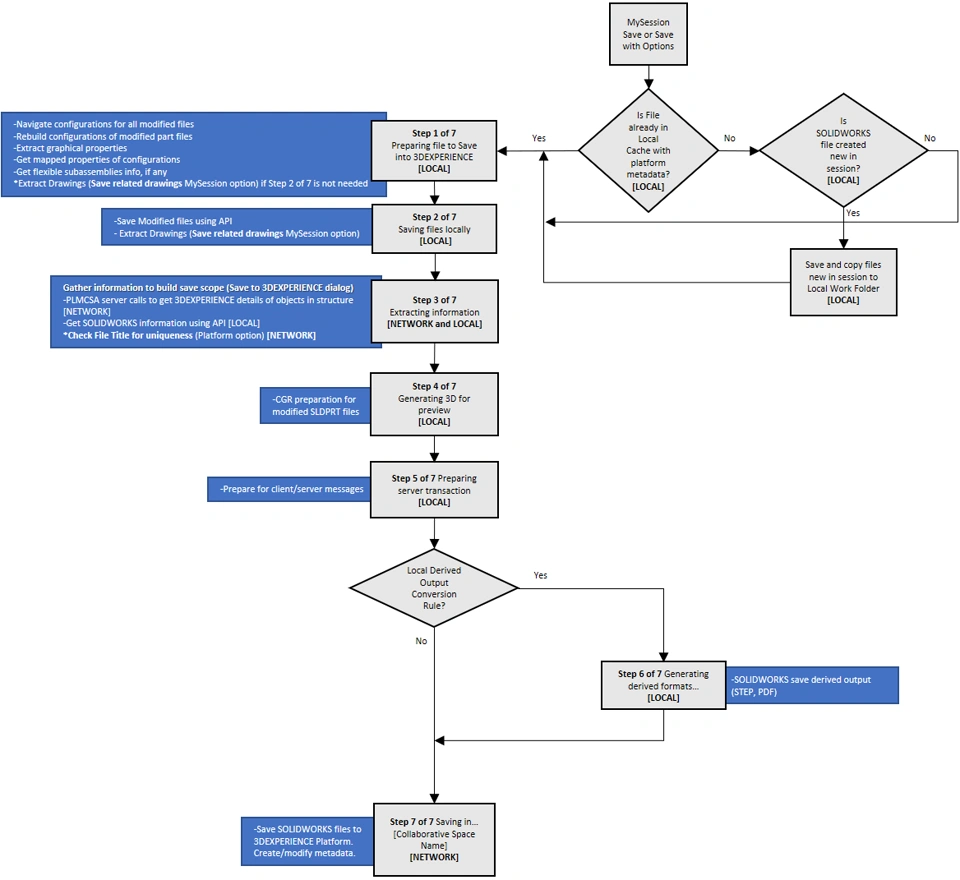 The following workflow image provides a detailed technical summary of what happens when you save a SOLIDWORKS file within the MySession app from the 3DEXPERIENCE task pane.