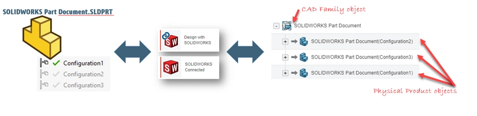 In this illustration, a single SOLIDWORKS part (SLDPRT) document that contains three configurations creates one CAD Family object and three Physical Product objects within the 3DEXPERIENCE platform. Each SOLIDWORKS configuration is a Physical Product object.
