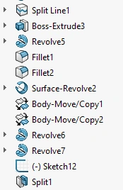 Now you can easily move them up and down (provided you are trying not to move above its parent feature). If you had tried to move them without creating folder then SW would thrown an error that "Non Contiguous features cannot be added to a folder" (which is exactly what we are doing the other way I guess 😛 ). Now the folder is moved below "Revolve5"
