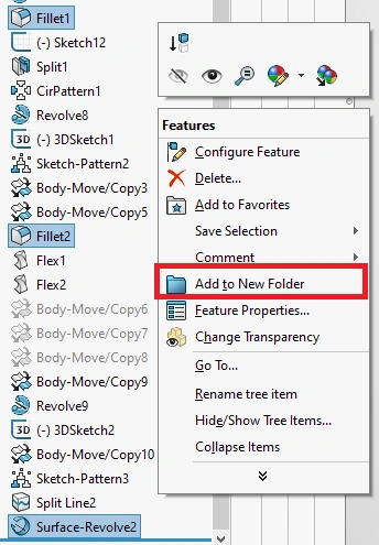 Once selected, right click anywhere inside the feature tree and click on "Add to New Folder".