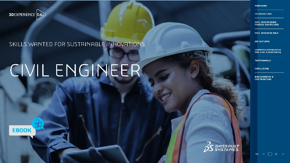 Discover our new ebook published by the 3DEXPERIENCE Edu team as part of a series called "Skills wanted for sustainable innovations” that share our view and the ones of our ecosystem on key roles and skills critical for the Industry Rennaissance to empower the workforce of the future. This one is about the role of Civil Engineer.