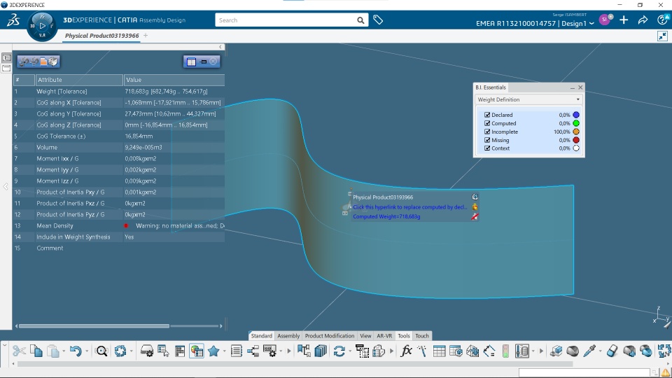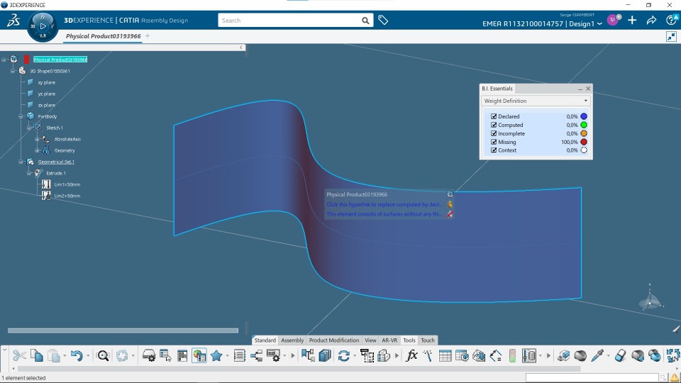 By default, when you try to compute the weight of a part made of surfaces using the B.I Essentials/Weight Definition command, the result is 0kg and you get the message "This element consists of surfaces without any thickness". Even if you have applied a Covering Material with a thickness it will not work.