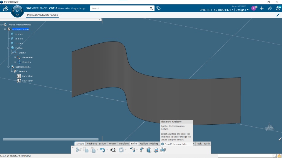 What you need to do is to apply a thickness on the surface(s) using the Thin Part Attribute command from the Generative Shape Design App.