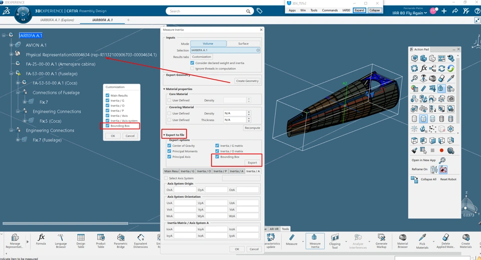 Using the Inertia tool, you can quickly see and export several attributes, including the Bounding Box dimensions for the overall assembly and all components. You can also create geometry for CG in a separate part or an existing one.