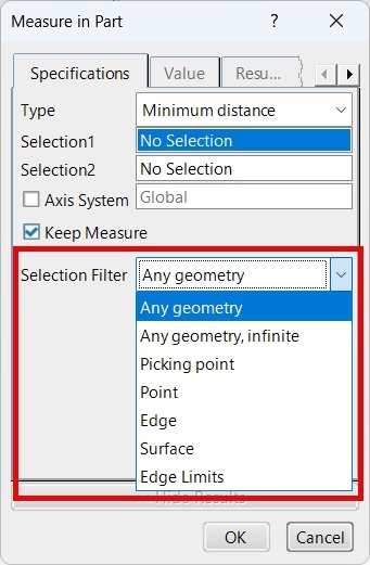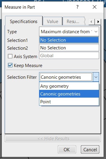 There are some cases where you need to use advanced selection filters for measuring inside a part. For example, trying to measure the maximum distance between a point and a curve. As we know, to measure between the point and the curve itself (not its center point), one must select "any geometry, infinite" in the Measure panel.