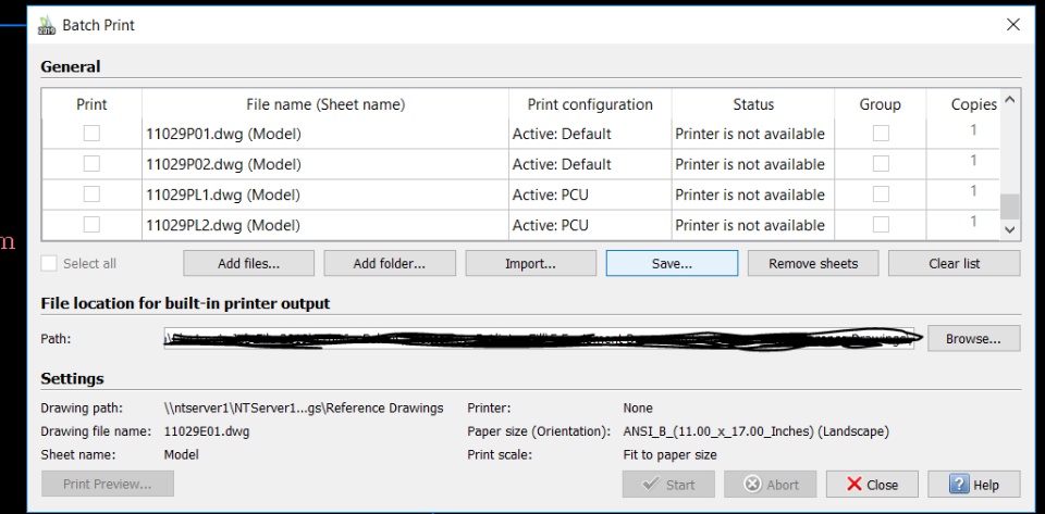 Issue 1 : Batch print window freezes when i try to delete layout files and only try to print Model files of my .dwg drawings i.e I tried selecting like 14 .dwg files which had both (model +layout) files in it and deleted all the layout files so that i could print only model files but in the process of deleting Layout when i delete the last Layout my window freezes as shown in below pic