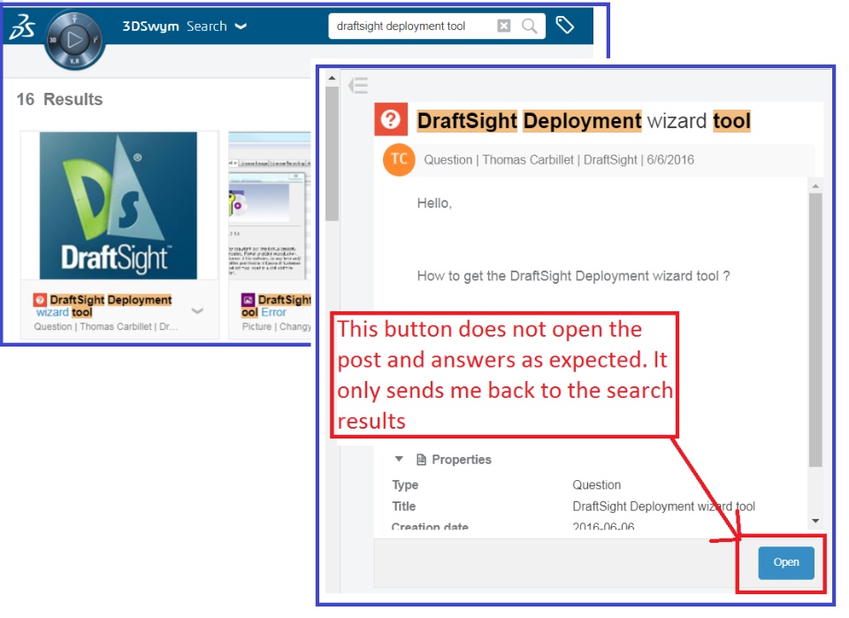 When I use the "Search" feature in the 3DSwym Communities, it gives me a list of results. For example, I searched for "draftsight deployment tool" and got 16 results. If I turn on the "Preview" feature, I can see the question that a user asked. In the attached example, they asked their question in 2016. But I can't see the answers. If I click the "Open" button in the lower right, it only sends me back to the results page. How do I search and view the answers? I have tried this in multiple browsers and multiple computers.