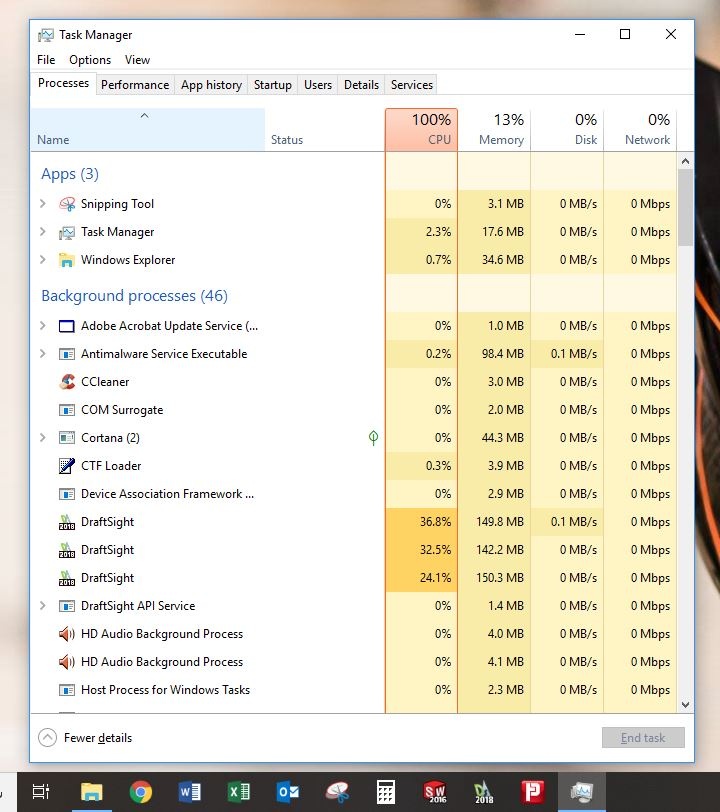 When I close DRAFTSIGHT, the process in the Task Manager doesn't close and and my CPU climbs to 100%