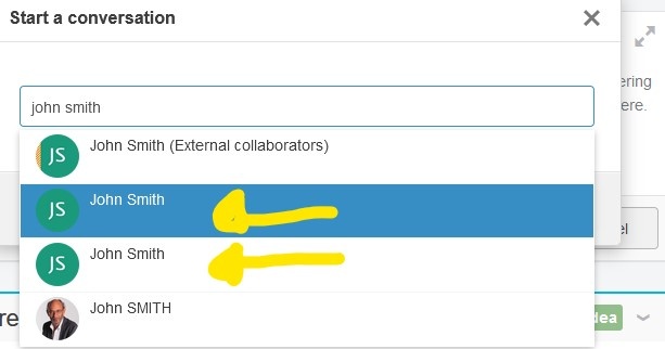 When trying to start a conversation with someone with a common name (i.e. John Smith) it is often impossible to know who is who without knowing their email address.
