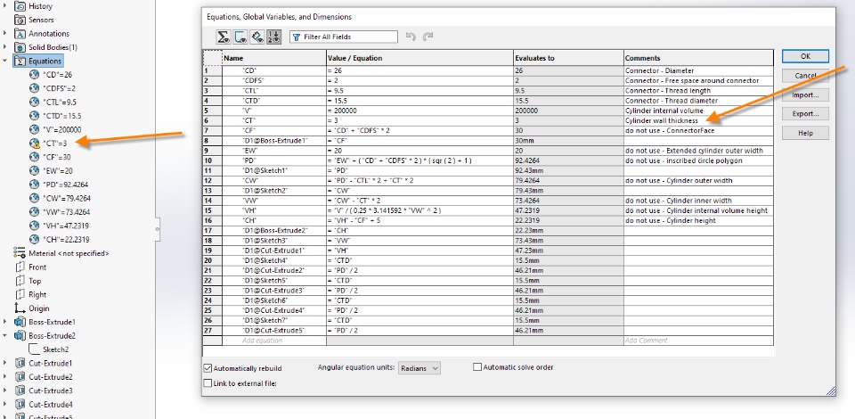 When I use the word "thickness" in the equation comments I get a warning in the feature tree. Pretty weird to be honest. I haven't used this word in this design except for commenting. Why????