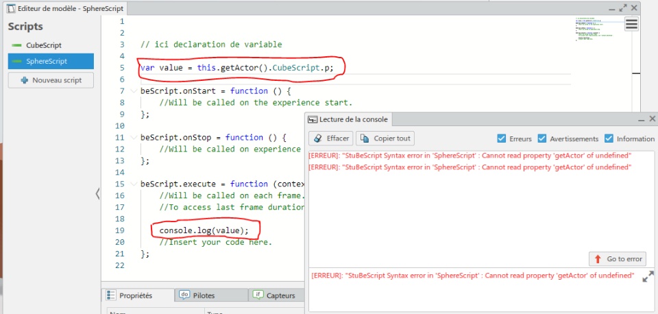 Hello, I am working on 3Dexcite, recently faced with a problem which I can't figure out by myself and would really appreciate if somebody could help me with it. The problem is that I have two 3DActor(Cube and Sphere) and i add them à script. each actor has it own parameters value when i am trying from SphereScript to acces or get one parameter value from CubeScript i am getting error .i have attached a screenshot