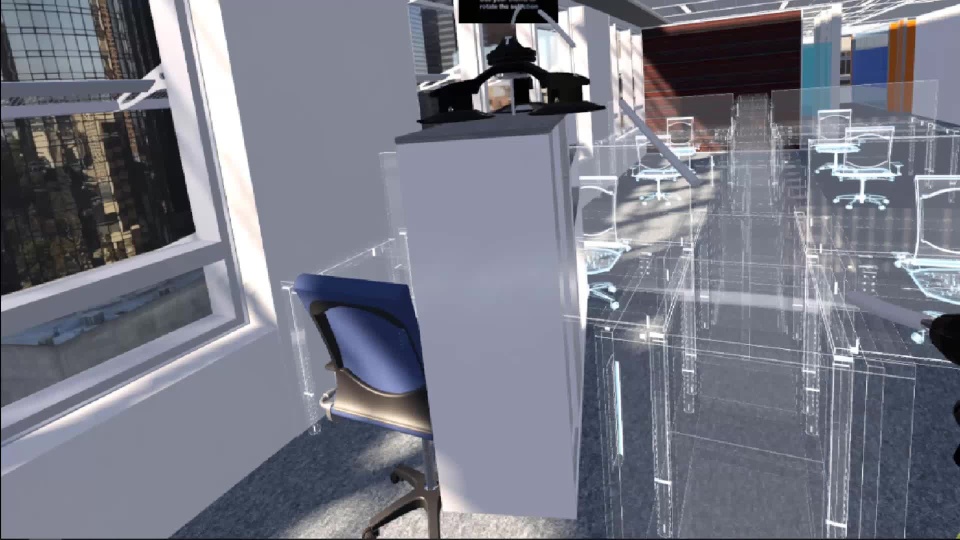 With «the palette», users can change the materials for the different pieces of furniture.All these custom behaviors have been implemented by adding code to the ‘built-in’ scripts provided on the HTC Vive preset.