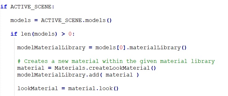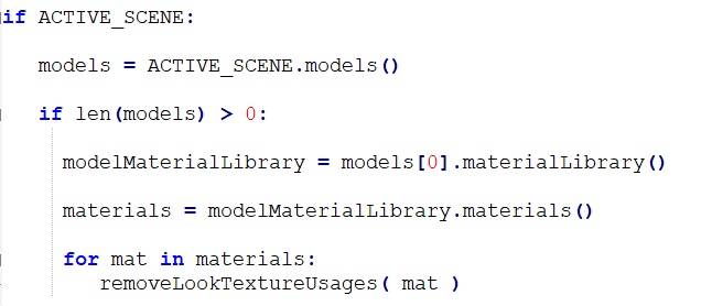 Let’s write a script! First, we need to traverse all materials in the Model library of the active scene and call a helper function “removeLookTextureUsages” for every material: