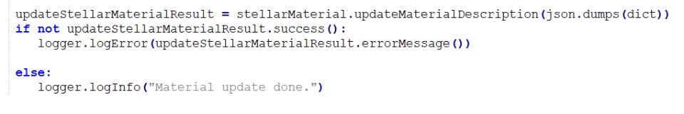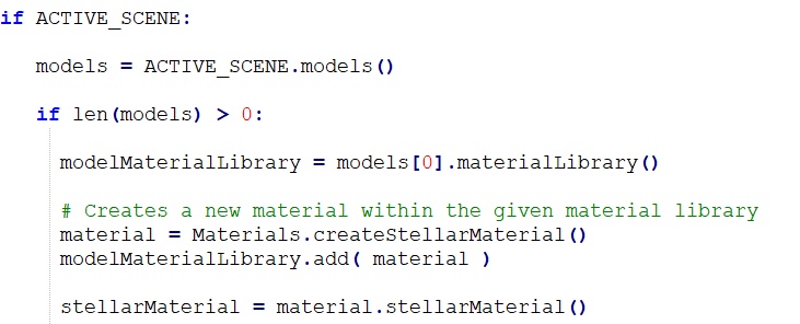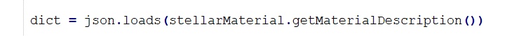 At this point in our script, we have access to the actual Stellar RenderMaterial. There are no dedicated methods for accessing all of the contained parameters. Instead, a JSON object can be retrieved, which holds the parameters of the material:
