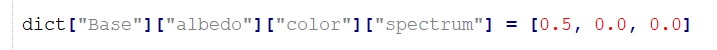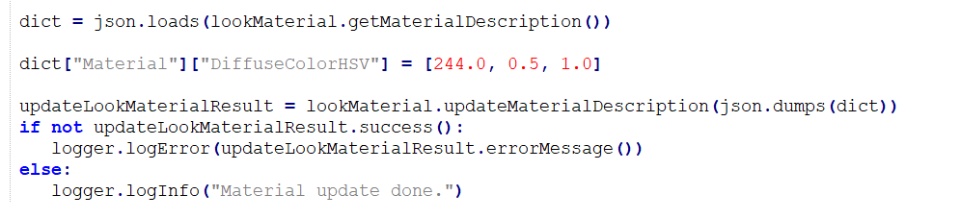 The code line, where we set the color value, still looks like magic. How will I know how the properties in the JSON data structure are named? The solution is quite simple: You can print the material description to a file and open it in a JSON editor: