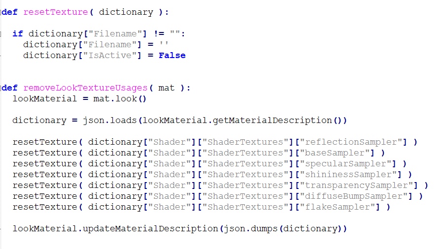 Let’s inspect this helper function: It accesses, like in the previous examples, the JSON description of the material. All subdictionaries for the texture samplers are passed to the resetTexture function. This clears the file name and sets the “IsActive” property of the sampler to False.