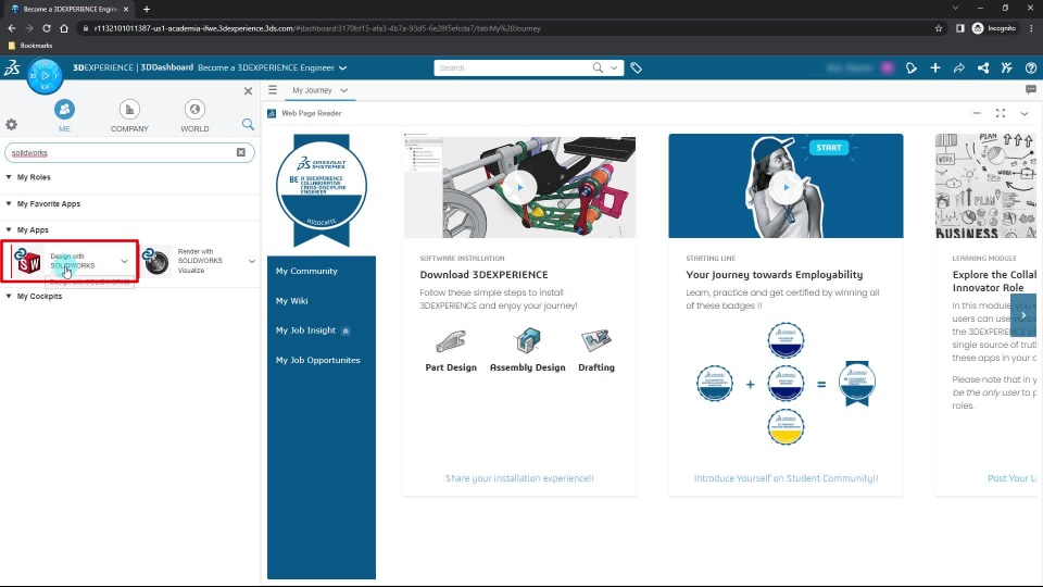 To connect SOLIDWORKS with the 3DEXPERIENCE platform, the end user needs to request the ‘3DEXPERIENCE ENGINEER for Students’ Role. When you click on this role, you will be able to see the “Design with SOLIDWORKS” app.