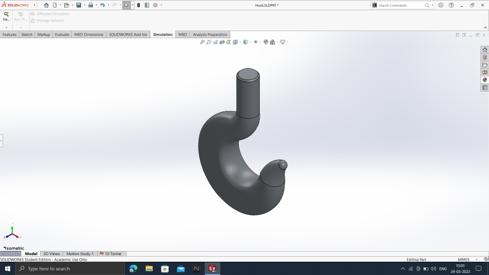 I have designed this EOT hook by referring to the PSG Design databook and it can withstand up to 10000 Kg of load. The manufacturing material is Mild steel.
