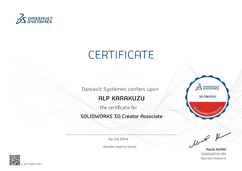 I want to share with you that I've received SolidWorks 3D Creator Associate and 3DSwymer Associate Certificates for the project preparations in the 2024 3DEXPERIENCE Project team thanks to our instructor @RP.
