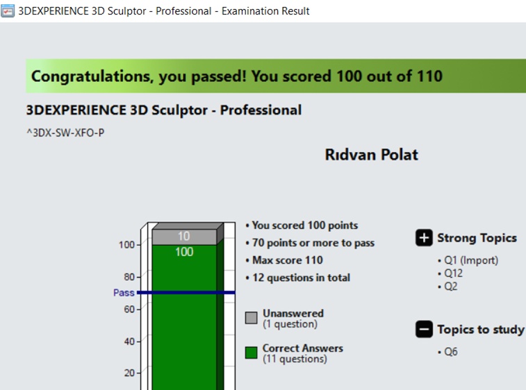 I have successfully completed the 3D Sculptor Professional certification exam. This is a practical exam. The exam consists of 12 questions in total, including 2 confirmation questions.