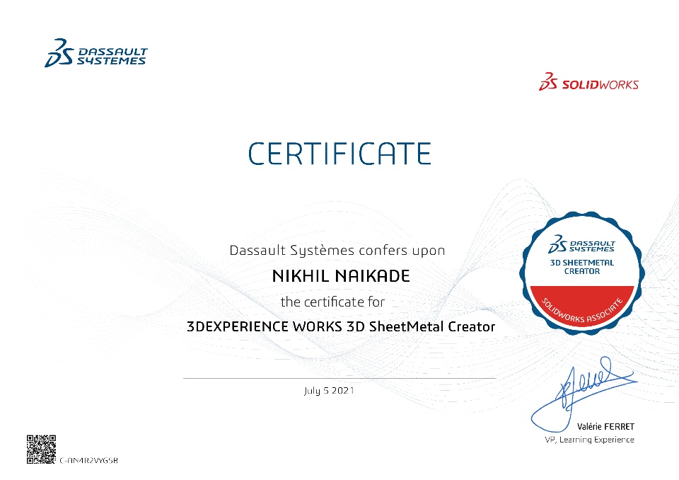 Successfully passed the #3DEXPERIENCE Works 3D SheetMetal Creator Exam offered by Dassault Systèmes SOLIDWORKS