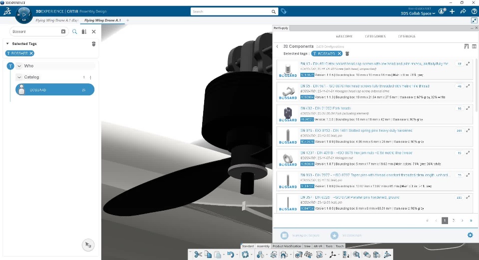 Thanks to this integration in CATIA, user can now easily look for standard Parts, filtering his search results thanks to tags such as categories, supplier name, country, or any other available information.
